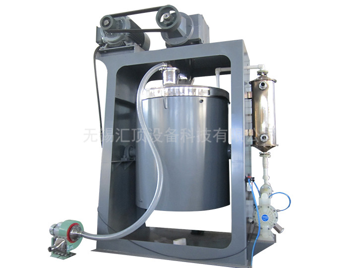 一種制造微粉的立式球磨機,它是通過電機驅(qū)動立式減速機,通過聯(lián)軸節(jié),帶動內(nèi)轉(zhuǎn)子研磨裝置旋轉(zhuǎn),使磨球、磨料、水混合液懸浮研磨。研磨過程中,水、磨料混合液通過循環(huán)系統(tǒng)連續(xù)循環(huán),直到達到標準。本裝置的特征在于:該內(nèi)轉(zhuǎn)子研磨裝置是由若干個沿攪拌軸螺旋上升的金屬攪棒垂直安裝的。